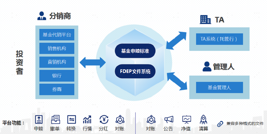 該平臺依托金融數據交換平臺(FDEP),在進一步規(guī)范香港基金申贖業(yè)務數據標準的基礎上,為香港基金分銷商、基金投資人服務行(TA)和基金管理人提供靈活的IT系統(tǒng)接口和文件傳輸服務,實現(xiàn)了“基金申贖電子化”和“對賬數據電子化”兩大功能,可全面支持基金申贖、撤單、轉換、行情、分紅、對賬、公告、凈值、清算等業(yè)務需要。